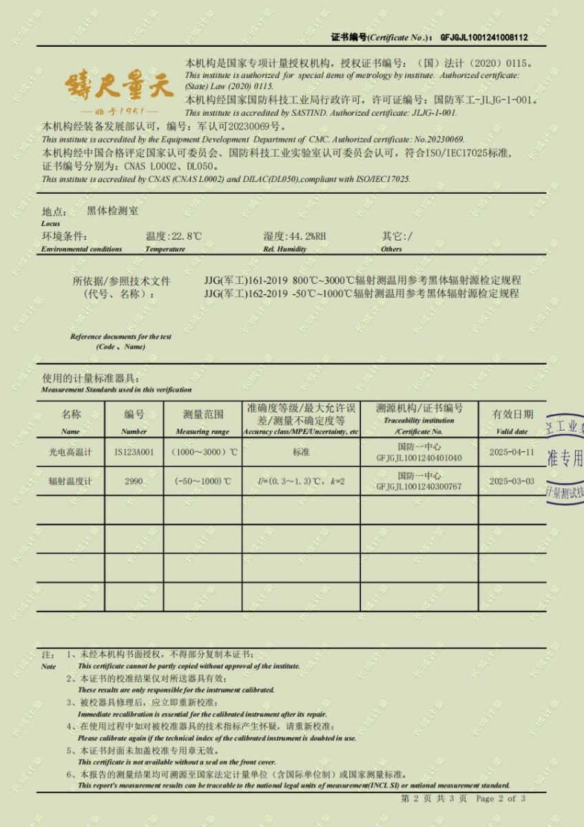 高溫黑體爐(700-1600℃)校準證書 2024-11-6 本文被閱讀 7298 次