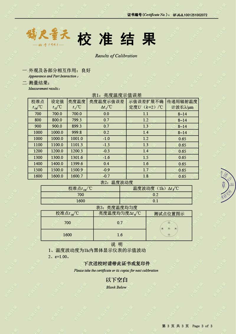 高溫腔式黑體輻射源(700-1600℃)校準(zhǔn)證書