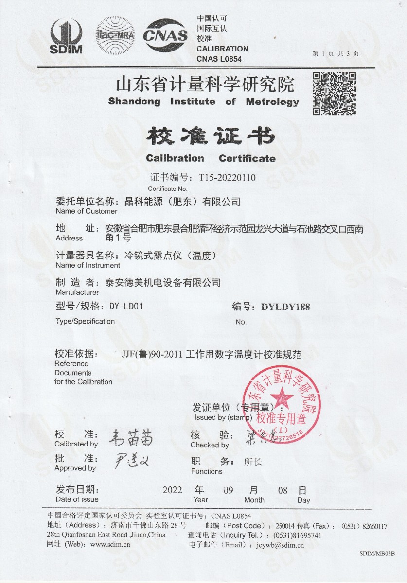 | 上一條:晶科能源(肥東)有限公司-冷鏡式露點(diǎn)儀檢定證書 | 下一條:廉金屬熱電偶檢定爐-校準(zhǔn)證書 |