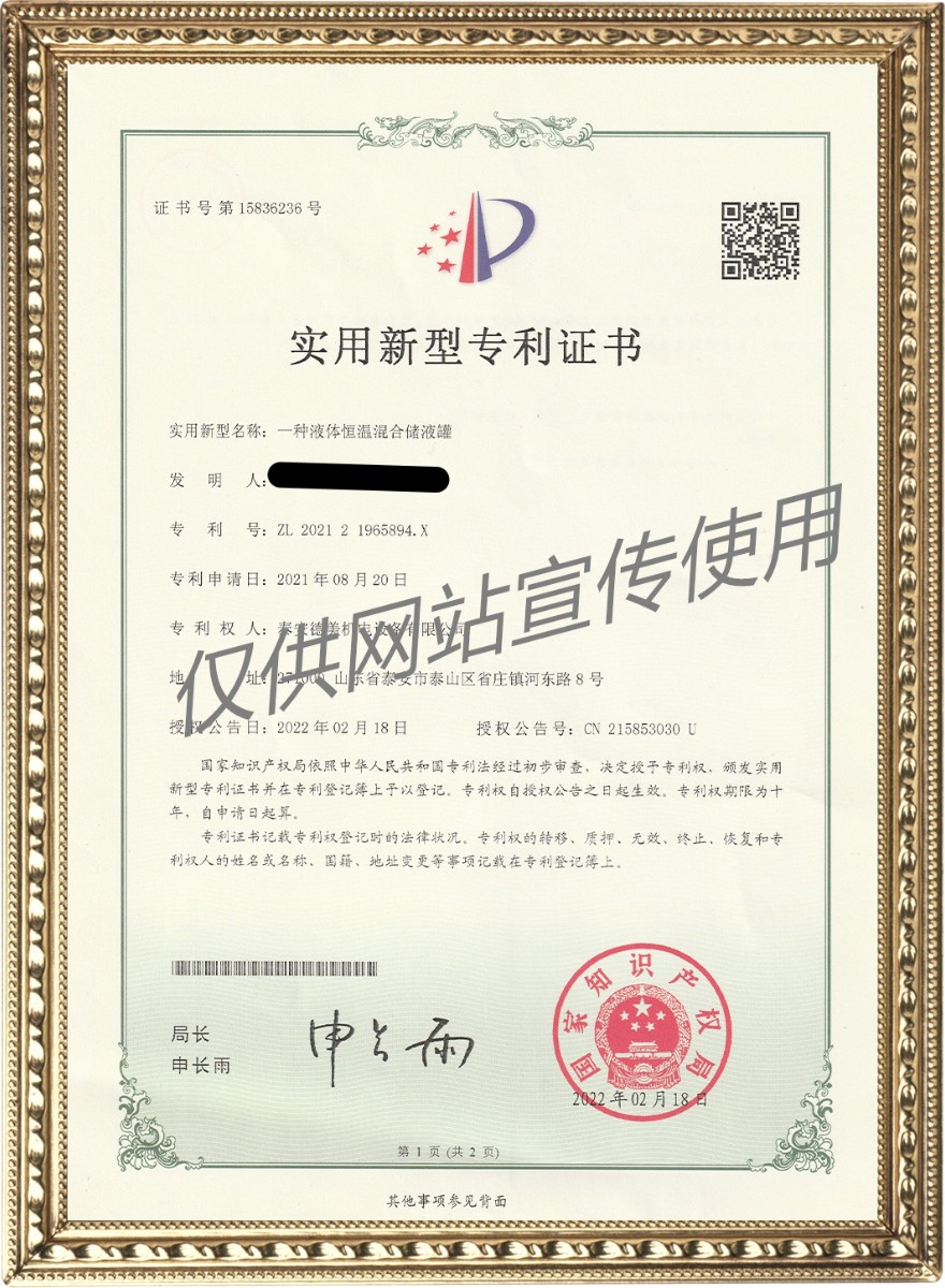 一種液體恒溫混合儲液罐——實用新型專利證書 2023-2-7 本文被閱讀 15604 次
