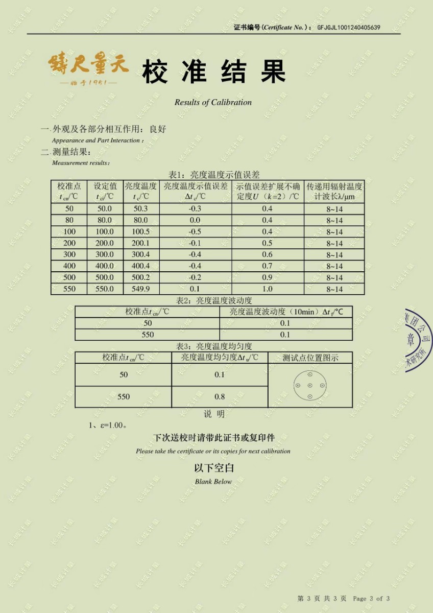 黑體爐校準證書 2024-4-24 本文被閱讀 10231 次