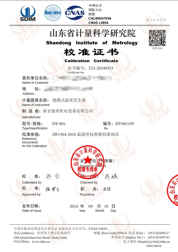 便攜式濕度發(fā)生器(5~50℃)校準(zhǔn)證書 2024-9-20 本文被閱讀 7426 次