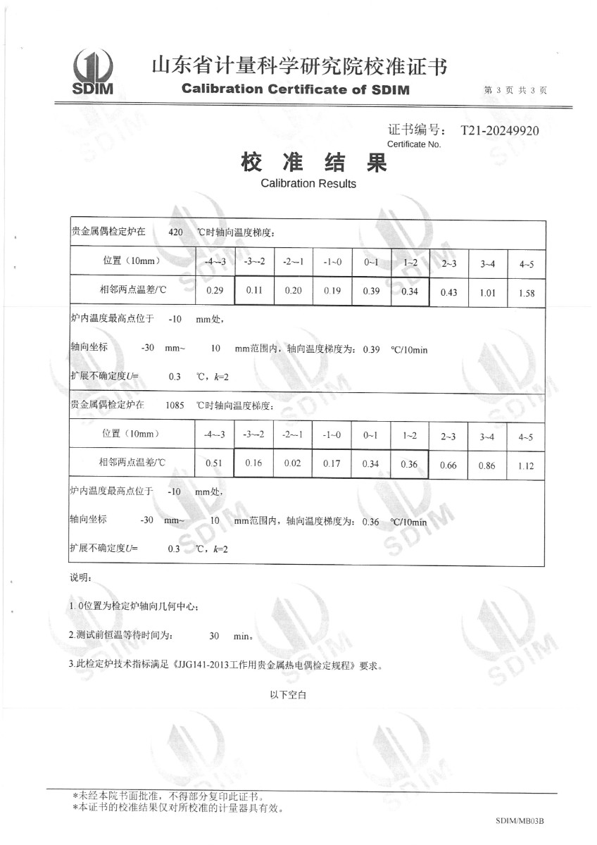 貴金屬熱電偶檢定爐(300~1000℃)校準(zhǔn)證書