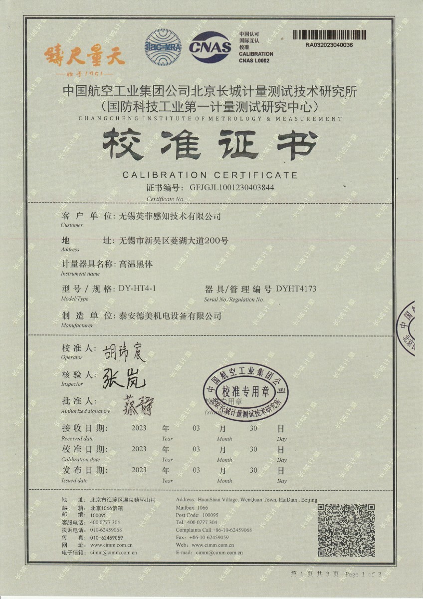 無錫英菲感知技術(shù)有限公司 高溫黑體 校準(zhǔn)證書 (2) 2023-5-4 本文被閱讀 12110 次