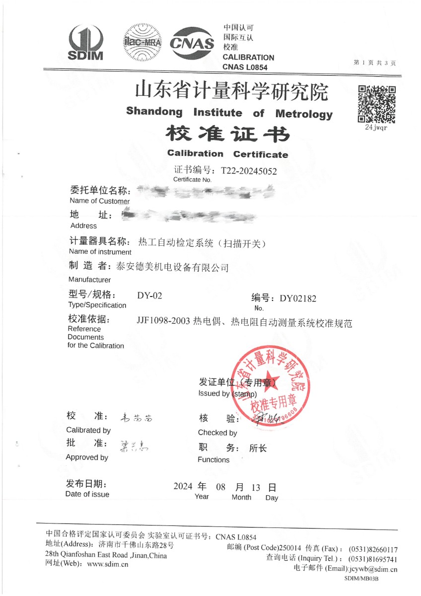 上一條:表面溫度計(室溫+5~400℃)校準證書下一條:廉金屬熱電偶檢定爐-校準證書
