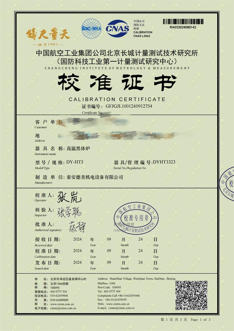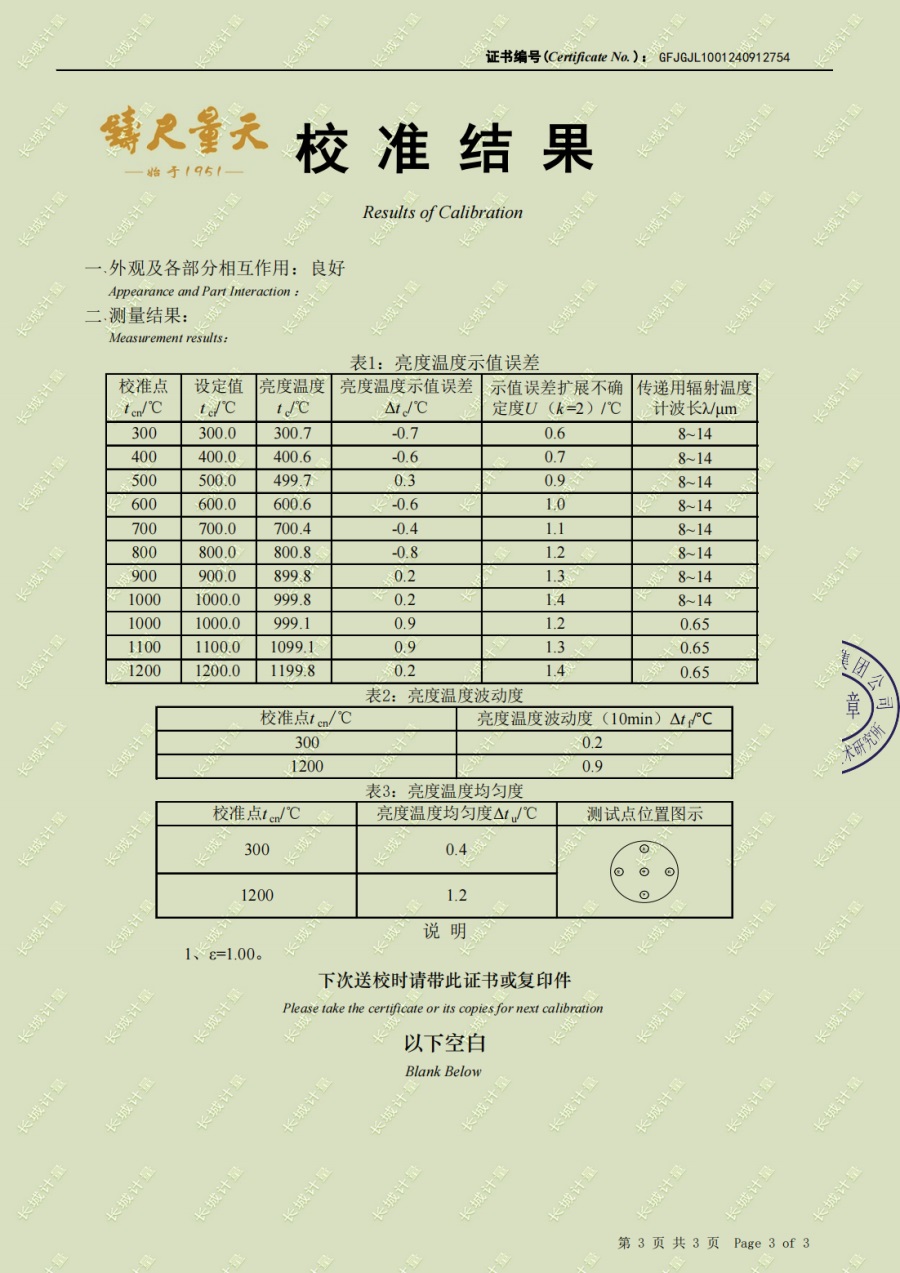 高溫黑體爐(300-1200℃)校準證書 2024-10-17 本文被閱讀 6357 次