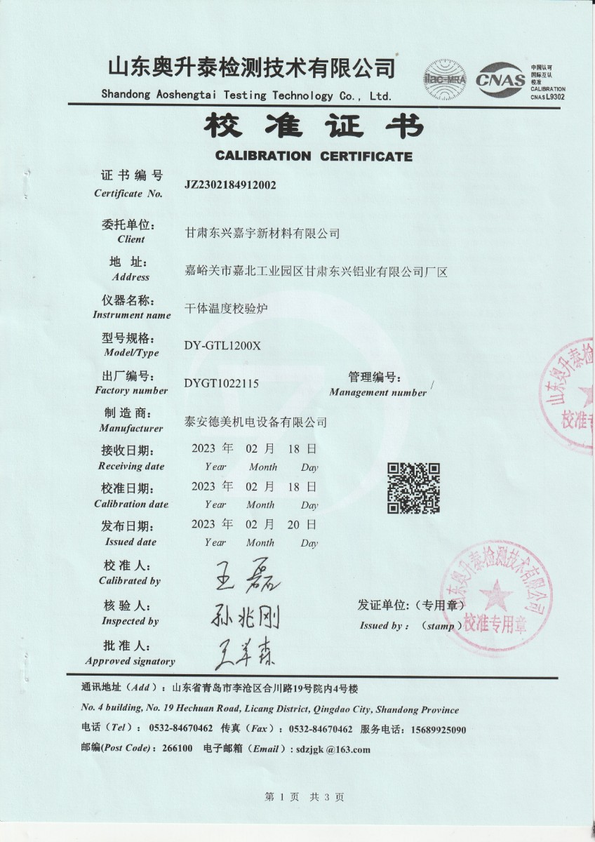 甘肅東興嘉宇新材料有限公司 干體溫度校驗爐 校準證書(2) 2023-2-25 本文被閱讀 14871 次