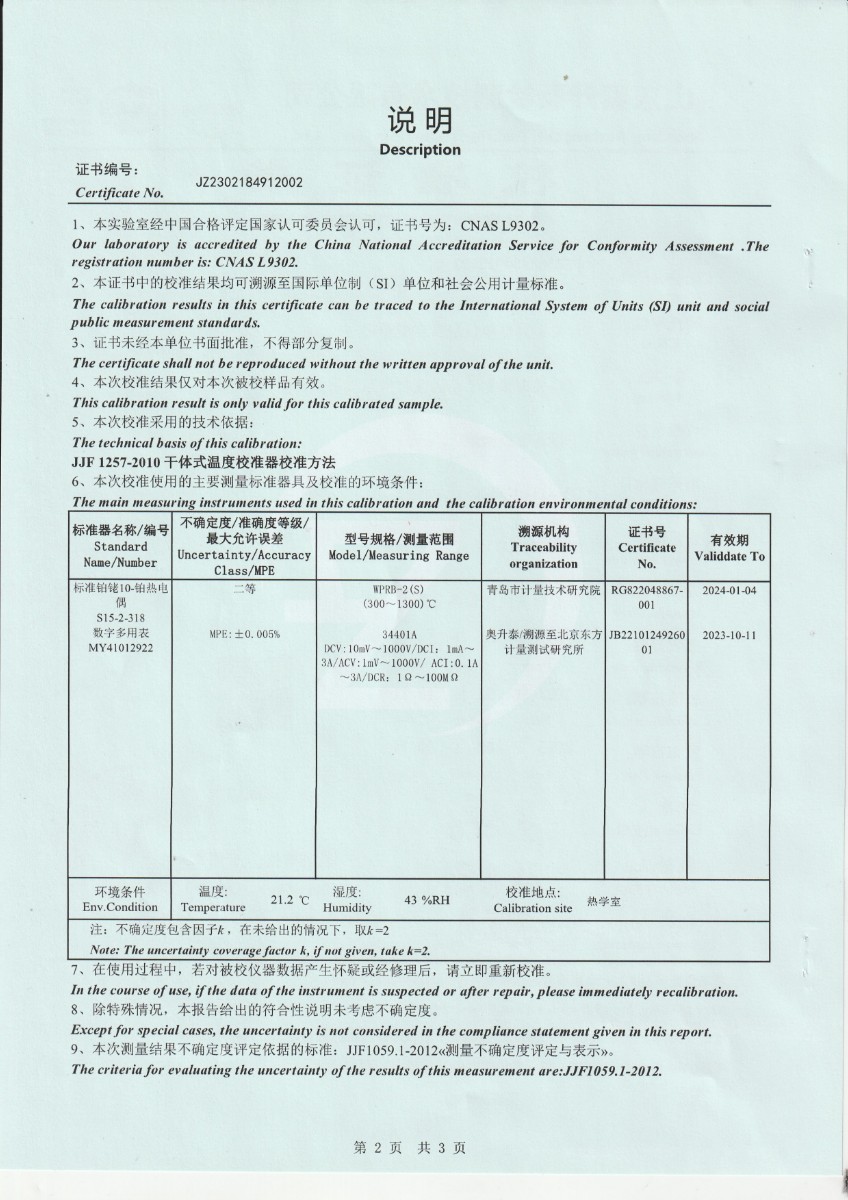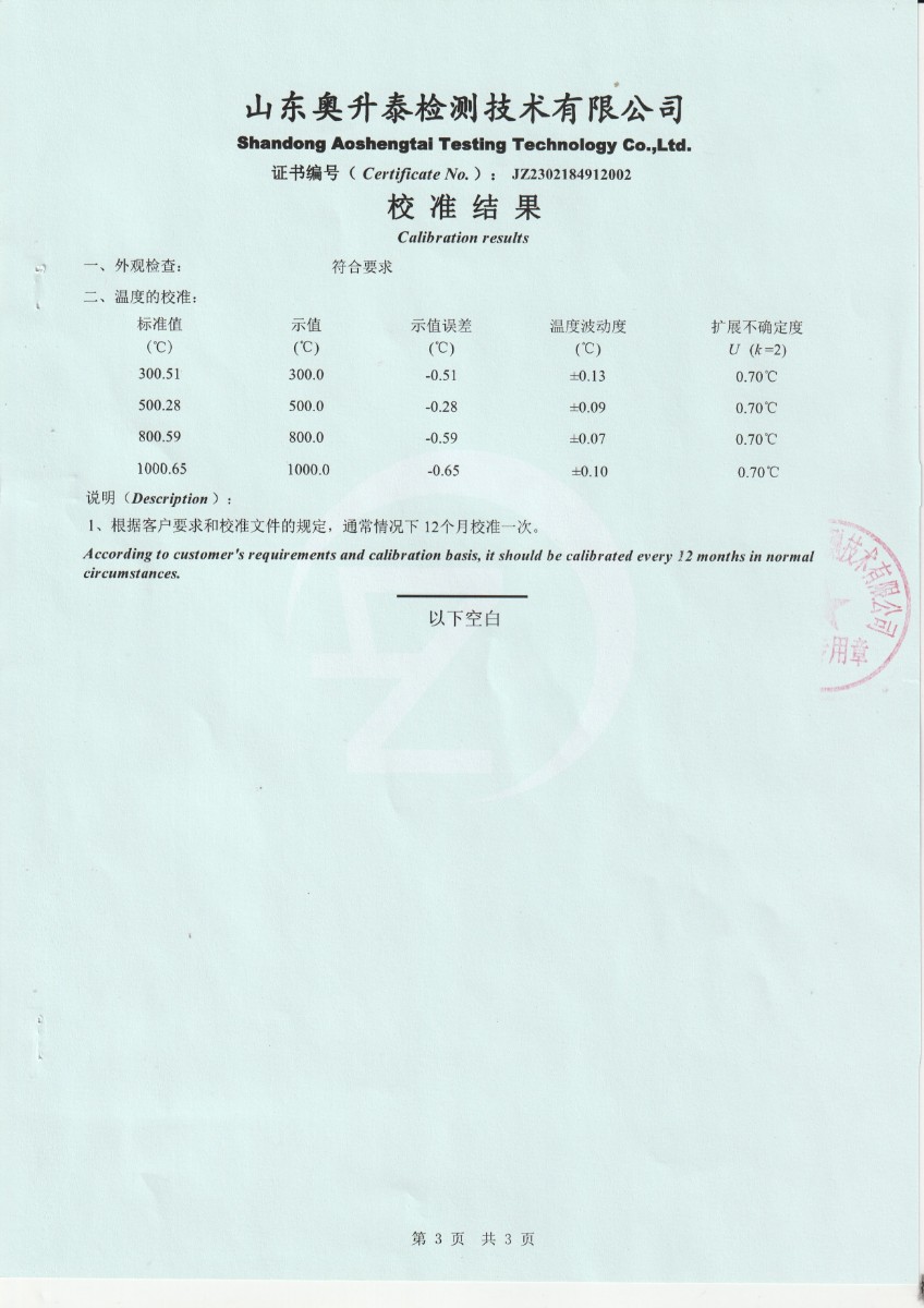上一條:甘肅東興嘉宇新材料有限公司 干體溫度校驗爐 校準證書(1)下一條:廉金屬熱電偶檢定爐-校準證書