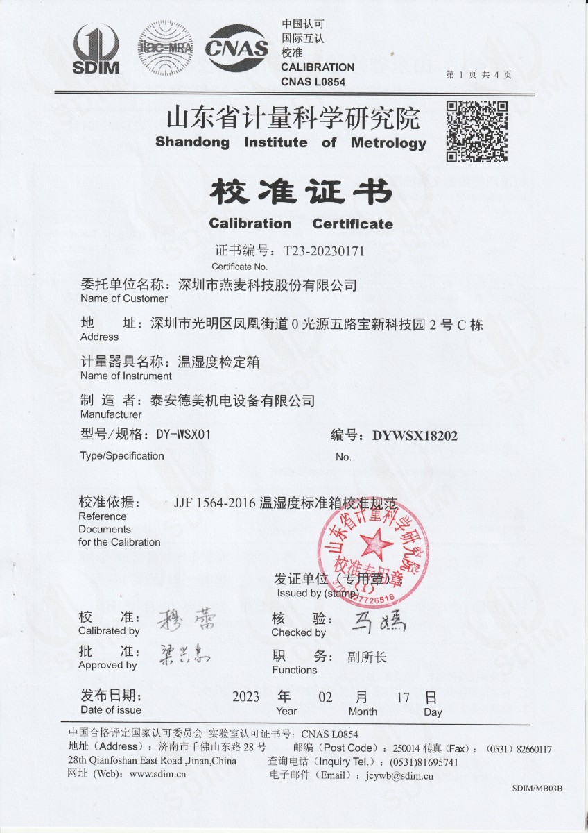 深圳市燕麥科技股份有限公司 溫濕度檢定箱 校準證書 2023-3-2 本文被閱讀 15373 次