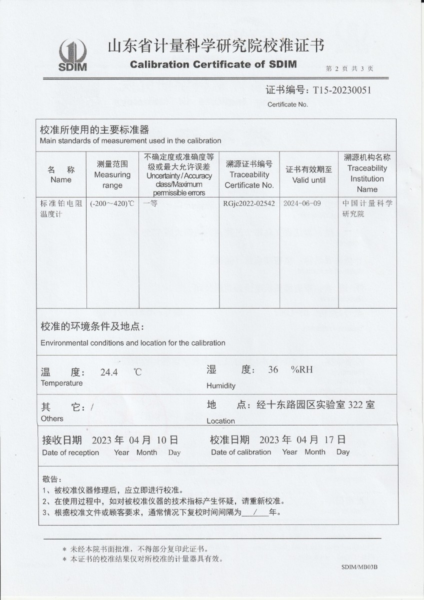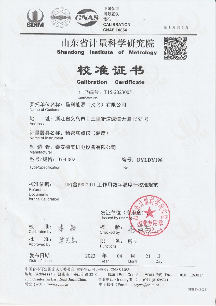 晶科能源(義烏)有限公司 精密露點儀(溫度)校準(zhǔn)證書 2023-5-4 本文被閱讀 13466 次