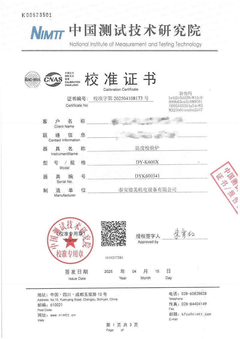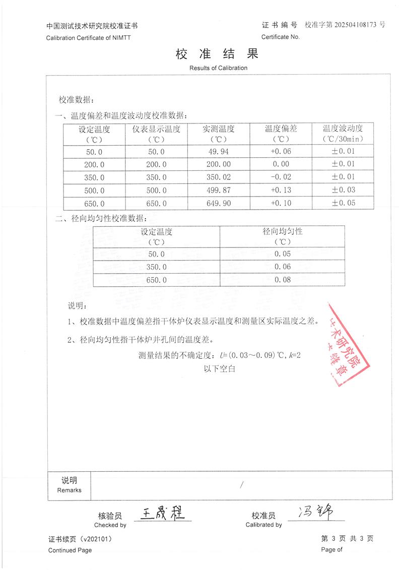 | 上一條:手提式恒溫油槽(70-300℃)校準(zhǔn)證書(shū) | 下一條:廉金屬熱電偶檢定爐-校準(zhǔn)證書(shū) |