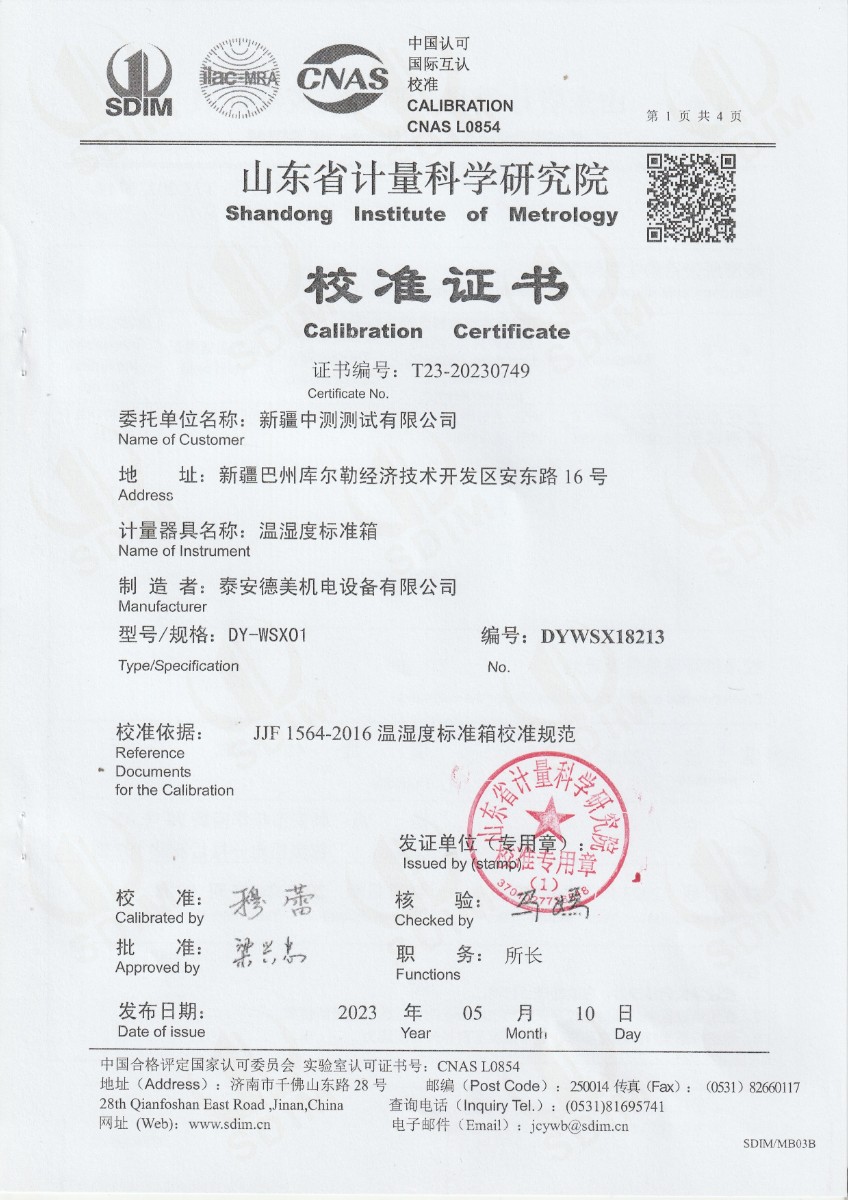 新疆中測(cè)測(cè)試有限公司 溫濕度標(biāo)準(zhǔn)箱 校準(zhǔn)證書 2023-6-1 本文被閱讀 13172 次