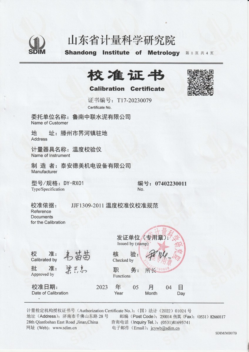 魯南中聯(lián)水泥有限公司 溫度校驗儀 校準證書 2023-5-26 本文被閱讀 15323 次